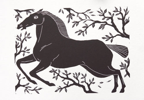 A black and white hand printed linocut art print depicting two greyhounds amidst snowdrops, with tree silhouettes in the background.