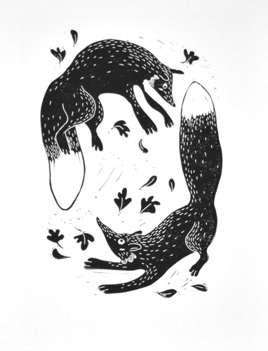Red fox linocut print illustration on a blue background with floral and tree branches.