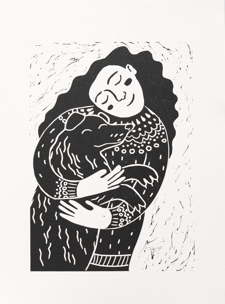 "My Best Friend" is an original handmade linocut print illustrating a person embracing their cherished dog companion.