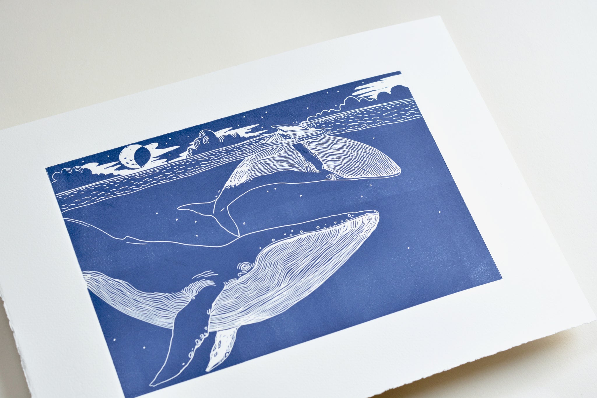 “The Depths of Motherhood” is an original linocut relief print depicting a mother whale and her calf. It is an expression and appreciation of the feelings of freedom of open water and wild swimming and the relationship between a parent and their young.