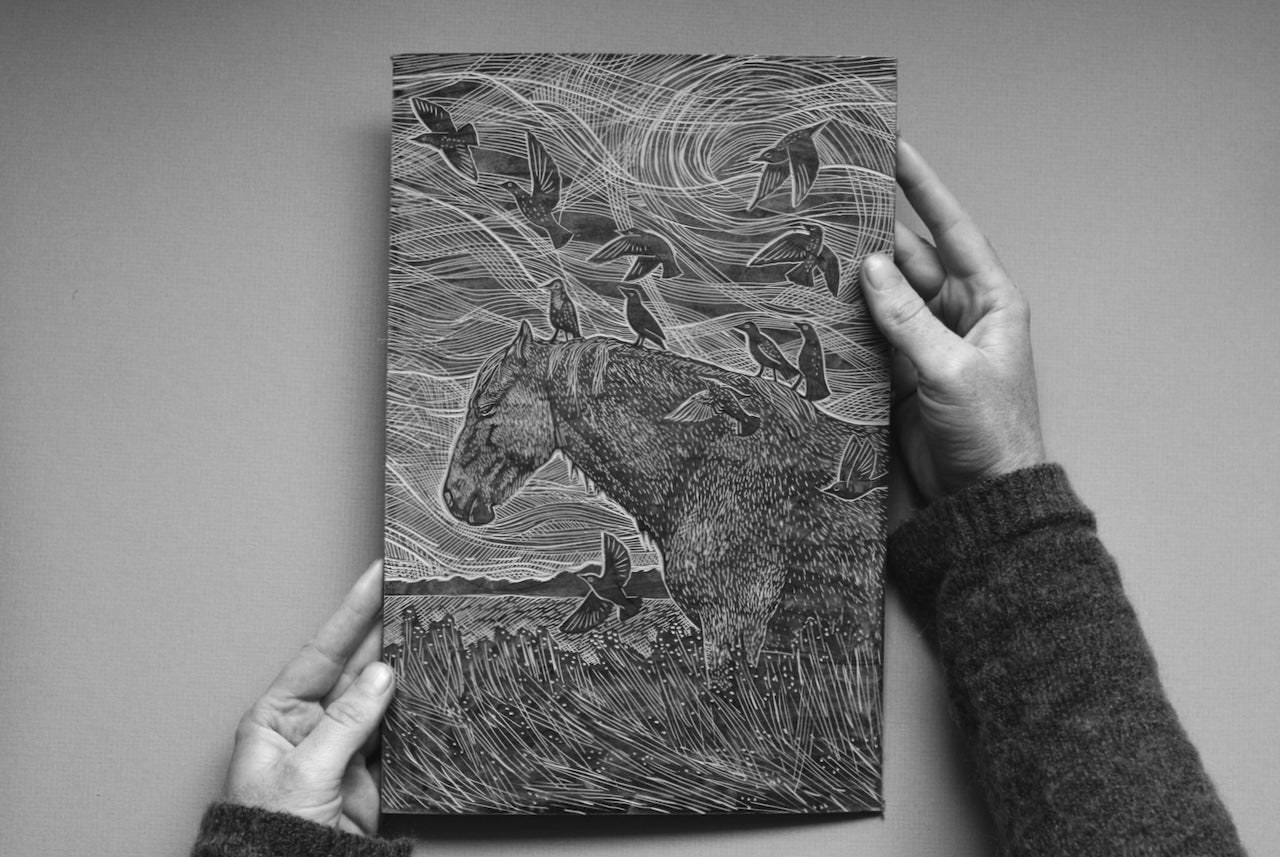 This hand-made and relieved in black-brown oil based inks in a traditional linocut technique, pressed onto high-quality, acid-free cotton paper for lasting preservation. Each print features subtle textures from the carving process and arrives signed and unframed, sustainably packaged. Made to order with a drying time of up to ten working days to ensure quality.