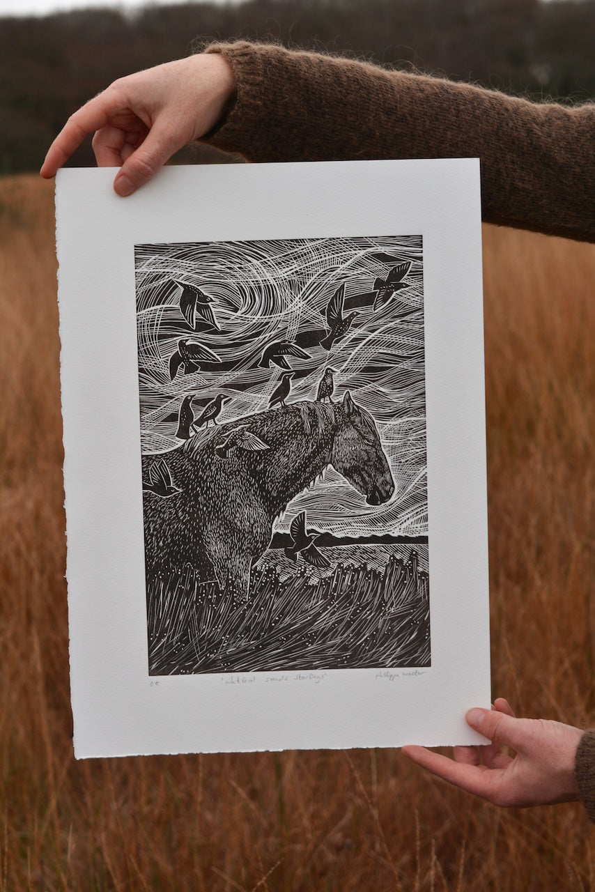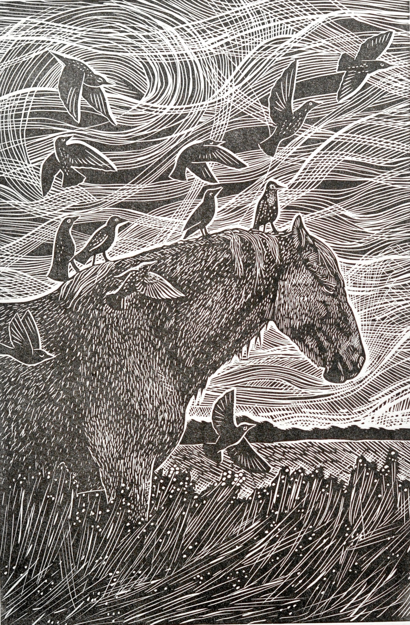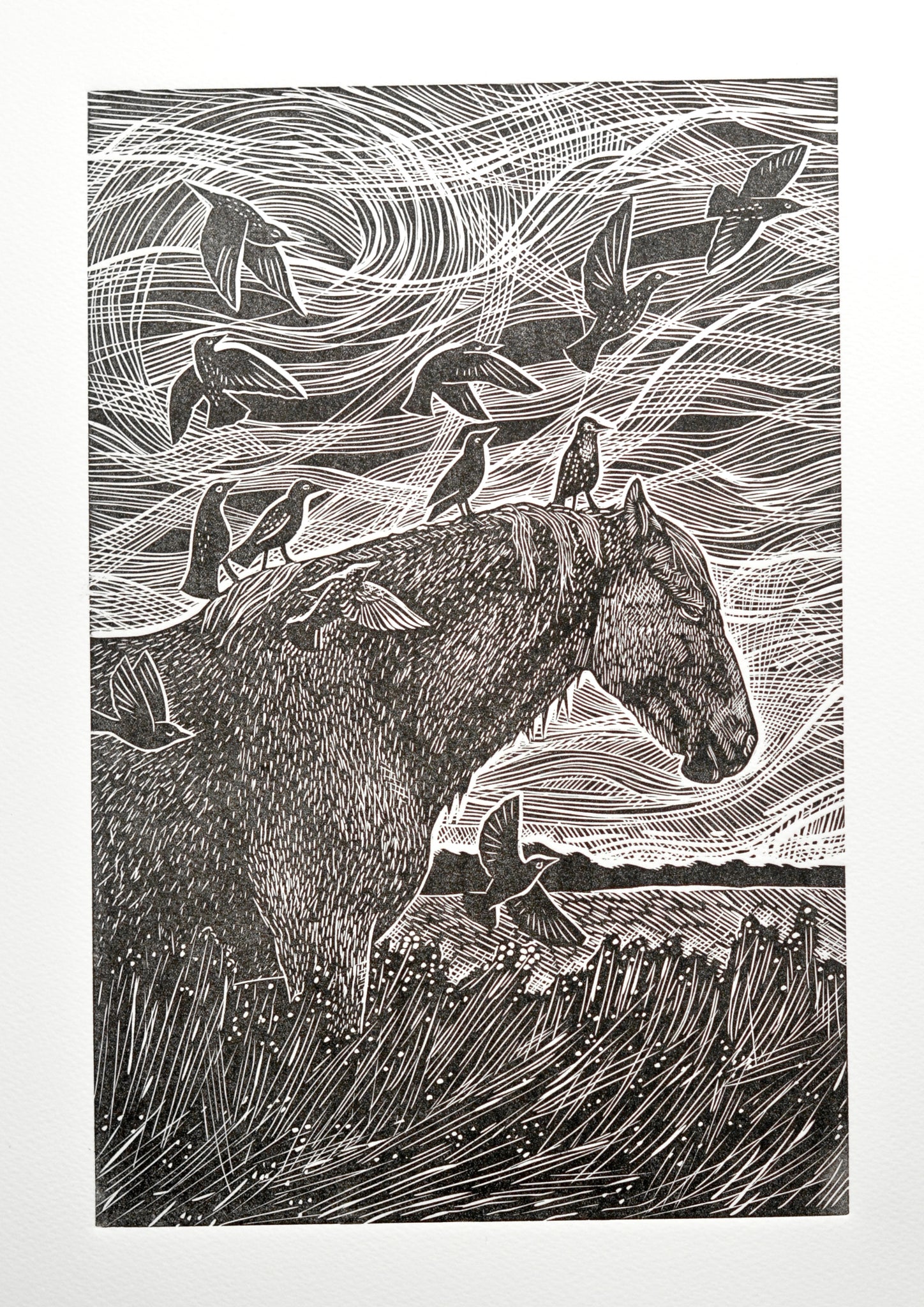 Part of the Gower series and depicting the relationship between starlings and ponies at whitford sands. The salt-marsh ponies seem quite patient with being used as a perch for these cheeky little birds.