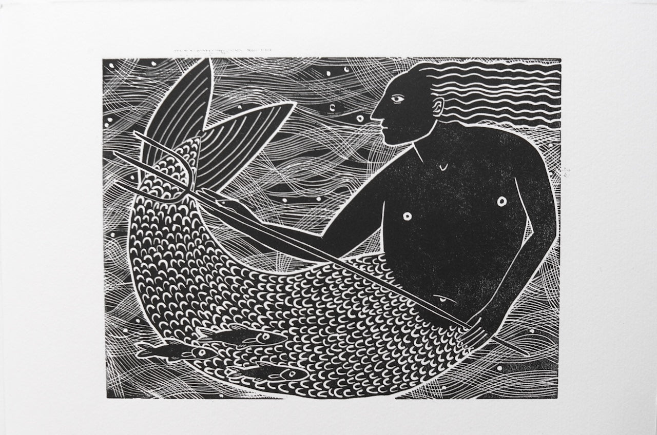 "Dilan," meaning Son of the Sea, is an original handmade linocut print featuring a merperson beneath flowing water with three fish swimming nearbyThis linocut is handmade by carving a reversed design into lino, then inking and pressing it onto thick, acid-free archival paper made of 60% cotton. The process creates subtle texture marks called "chatter," giving each print a unique character and lasting quality.