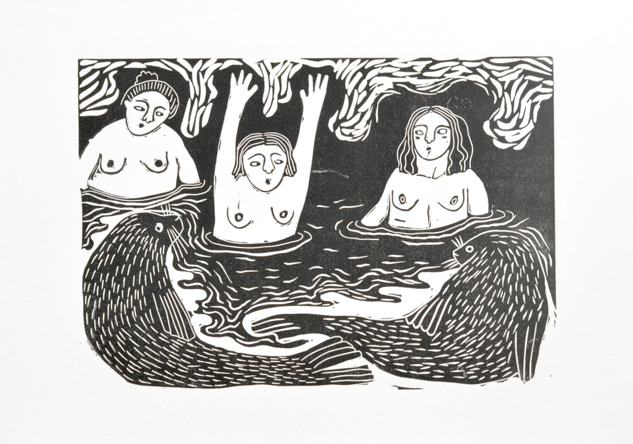 The Selkie Girls is a charming original linocut print featuring joyful selkie girls frolicking freely in the ocean.
